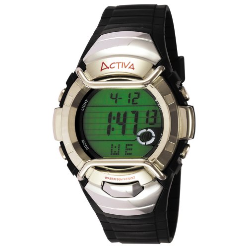 Modernize your wardrobe with the Activa Men's Multi-function Digital Watch. With highly durable plastic protection, the circular, digital-green dial is sharply framed by a silver-tone plastic bezel with futuristic shaping and silver-tone buttons. The vivid black case is matched by the sporty band that is etched with a striping pattern and fastened with a practical buckle clasp. The dial flaunts multiple functions, including an easy-to-read, black digital time clock, a fun, oval-shaped digital sub-dial, and day and date indication. Expertly crafted, this superb timepiece boasts water resistance to 165 feet, the reliability of digital-quartz movement, and an exclusive Activa gift box for spectacular presentation.